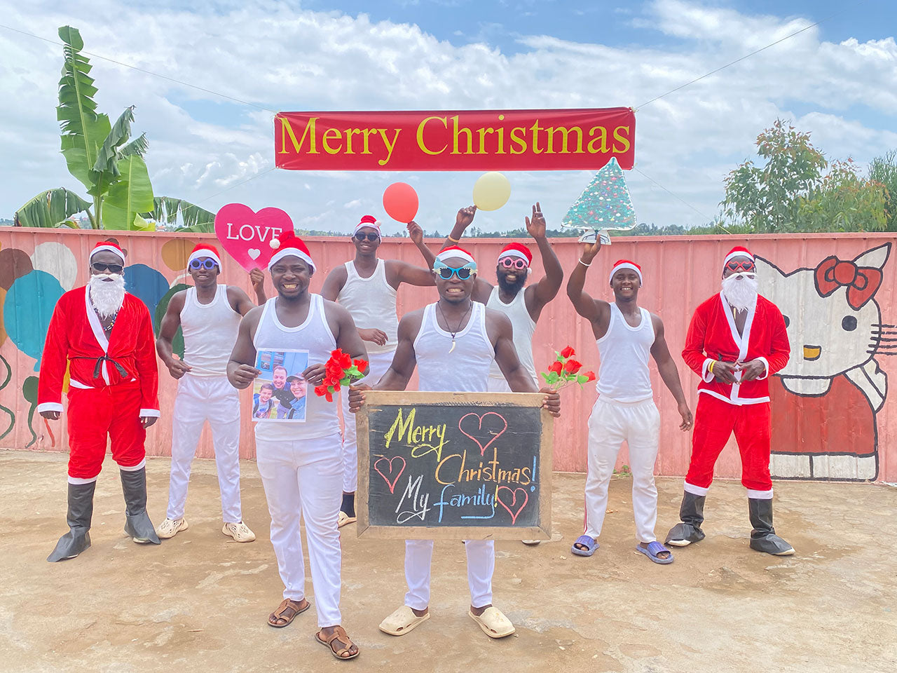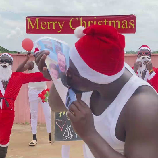 Das Afrikanische Fitness Team wird für Sie singen, tanzen und Sie grüßen. Sie können bis zu 20 Wörter auswählen, die sie vortragen werden und bis zu 15 Wörter wählen, die sie auf die Tafel schreiben. Außerdem können Sie ein Bild hinzufügen, welches in die Kamera gezeigt wird.